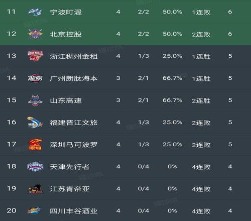目前北京和广东4胜0负领跑全联盟,辽宁和广厦分列三四名,而天津、江苏和四川则是一生难求,0胜4负排在联盟最后三位。