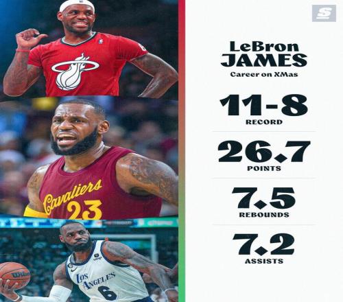 北京时间明日,一年一度的NBA圣诞大战即将打响。今日,美媒晒出了湖人球星勒布朗-詹姆斯的圣诞大战数据。