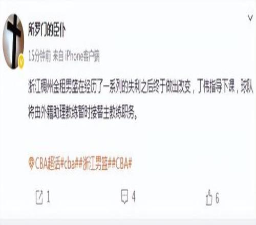 丁伟是在上赛季常规赛后半段接替王世龙带队,并带队出战季后赛。本赛季至今,浙江男篮仅取得1胜4负的战绩,排名联赛倒数第五。浙江队如果只是输给广东队、山西队还有情可原,可是他们在第一场比赛中输给了昔日超级鱼腩宁波,这就太不正常了。而上轮溃败于上海队也不正常,实际上海队本赛季在磨合上也有问题,战力比不上上赛季,面对上海队却被打成一边倒,这也实在尴尬。