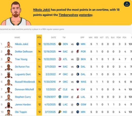 据统计,约基奇加时赛得到的18分刷新了NBA的加时赛得分纪录,此前的纪录为14分。