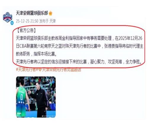 在昨天深夜,天津队也是发布了一个消息,那就是球队主教练周金利,因为家中有事要处理,所以,球队助理教练张德贵,代理球队主教练之职。天津队这公告,虽然显然是很客气。不过,大家都清楚,五连败的天津队,只能是让周金利下课了。就这样,天津队在半年之内,两次更换主教练,他们前面的主教练是张庆鹏,目前,张庆鹏在北控队执教。