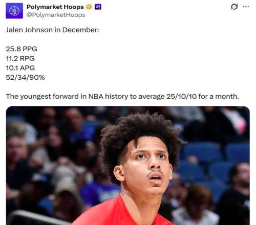 12月份杰伦约翰逊场均可以轰出25.8分11.2板10.1助1.1断三双数据,三项命中率52/34/90%,成为NBA历史上第7位单月至少交出25+三双球员。